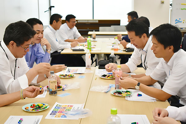 ワークショップ後半では、与えられたお題にレゴブロックと感性で応える「レゴシリアスプレイR」を実施しました。一見遊んでいるようにしか見えないのですが…「まず当社内で取り残されている人間は誰か」「環境・経済・社会は表裏一体だが、中でも当社だから推進するべき優先順位を決めるべきではないか」など、SDGsを自分ごと化した声がそこかしこで聞こえてくる、有意義なワークショップとなりました。
