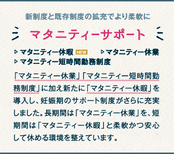 2019年4月には、女性をはじめとした全ての従業員が継続して活躍できる環境を整え、企業の持続的な成長に繋げることを目的に、“いろどりLAB(ラボ)”プロジェクトを発足。社内の様々な部署の、役職や職種、境遇の異なる女性従業員11名により結成され、2020年2月には、従業員の声をもとに企画した「不妊治療休業・マタニティー休暇」など、新たな制度を誕生させました。