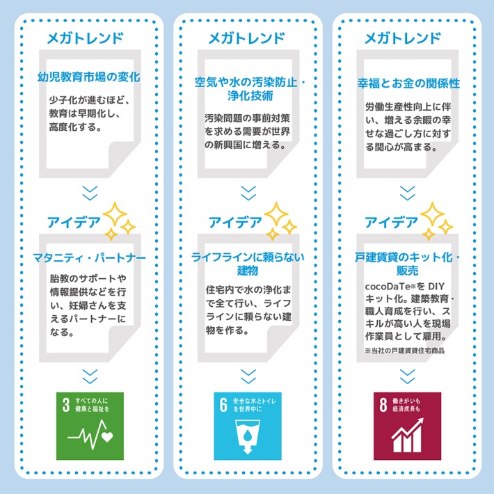 まずは、未来社会で起こると予測される、「地元から出ない若者が増加する社会」「空気や水の汚染防止対策・浄化技術開発が必要になる社会」などの54個のメガトレンド※に対し、大東建託グループが“できること”“すべきこと”を個別に考えることからスタート!