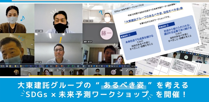 大東建託グループ「SDGs・ESG経営推進プロジェクト」では、2020年11月、“未来社会の大東建託グループ”を考えることで、大東建託グループの“あるべき姿”見つけ出すためのワークショップ「SDGs×未来予測ワークショップ」を実施しました。