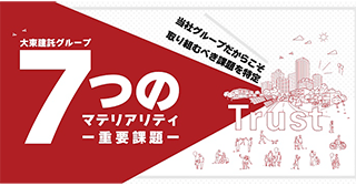 大東建託グループは、2021年、当社が特に重点的に取り組むべき課題を「大東建託グループ 7つのマテリアリティ(重要課題)」として特定しました。とはいえ、課題を特定しただけでは、社会に貢献することも、当社が社会にとって不可欠な企業へと成長することもできません・・・