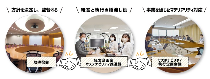 サステナビリティ推進課は、「経営(取締役会)」と「執行(サステナビリティ執行企画会議)」の間で齟齬が生まれないよう、それぞれの会議の橋渡しを行うだけでなく、社会から求められている当社の役割を各会議へ進言したり、統合報告書などを通して当社のサステナビリティ経営状況を報告するなど、当社と社会の橋渡し役としても活動していきます。