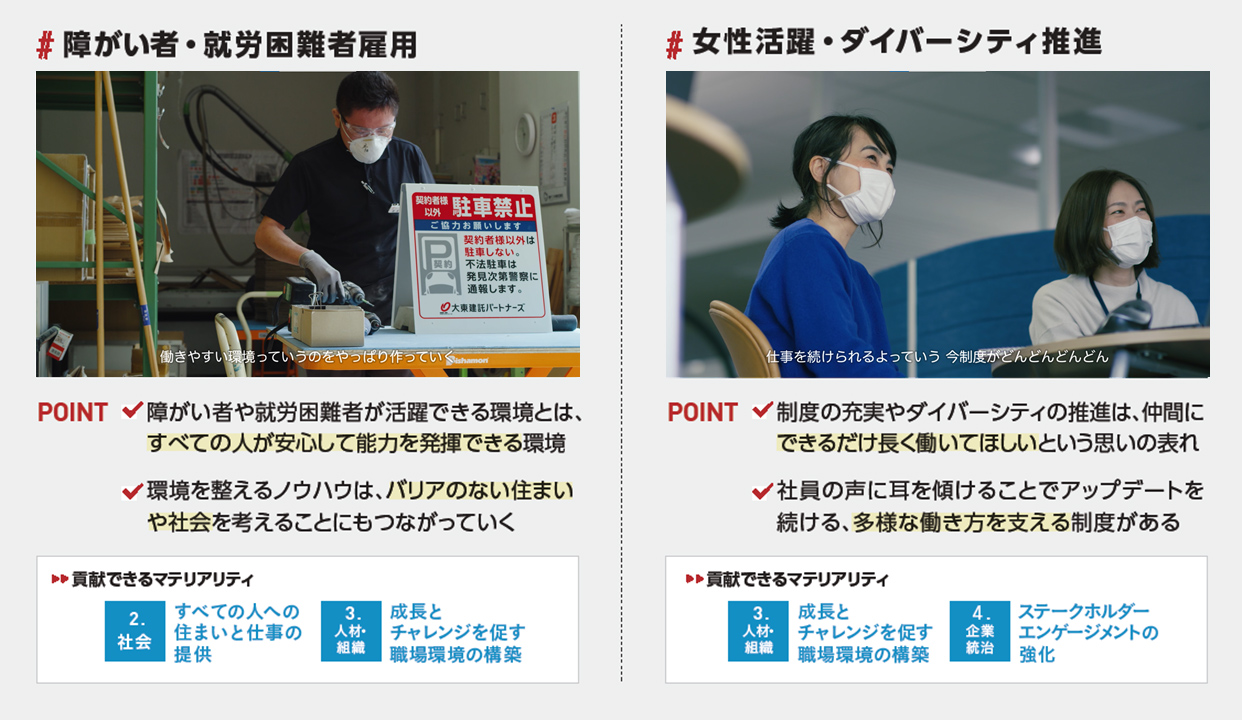 大東建託グループが社内外で取り組むダイバーシティ推進について紹介するとともに、さまざまな制度を利用する社員のリアルな声を紹介していています。