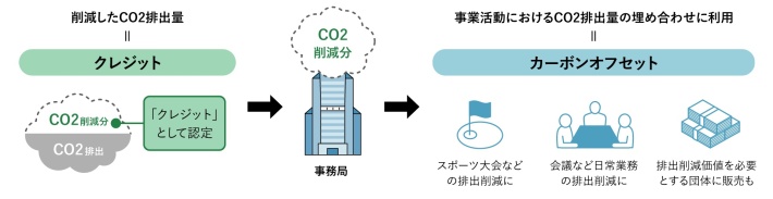 事業活動などで発生するCO2排出量のうち、どんなに努力をしても発生してしまうCO2を、省エネルギー設備の導入及び太陽光発電設備導入によるCO2削減量や、森林管理によるCO2吸収量など、他の場所で創出できたCO2排出削減・吸収分(クレジット)で埋め合わせる仕組みです。