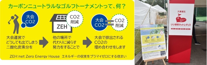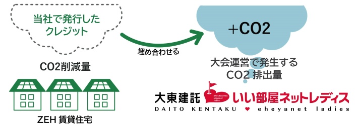 大東建託・いい部屋ネットレディスでは、2022年の第7回大会より、大会期間中の「電力使用」「シャトルバスの運行」「出場選手の車移動」「発電機燃料」など、大会運営により発生するCO2排出量に、大東建託グループが供給したZEH賃貸住宅などの省エネルギー住宅により削減されたCO2排出量を充てることでプラスマイナスゼロにする「カーボンオフセット」を実施しています。