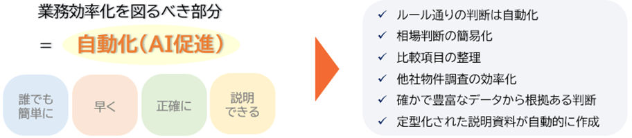 しかし、熟練者でも家賃設定は難しいのが現状で、オーナー様や関係者に説明する際の資料づくりは、データ量と個々の経験により、手作業で実施しており、多くの時間が割かれてしました。