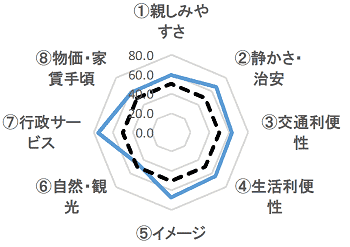 ・ニュータウン構想に基づいて計画的に開発された地域。街並みが整然としており、遊歩道が非常に充実している。都心へのアクセスも良く将来性の見込める地域である。(男性・67歳・既婚・無職)