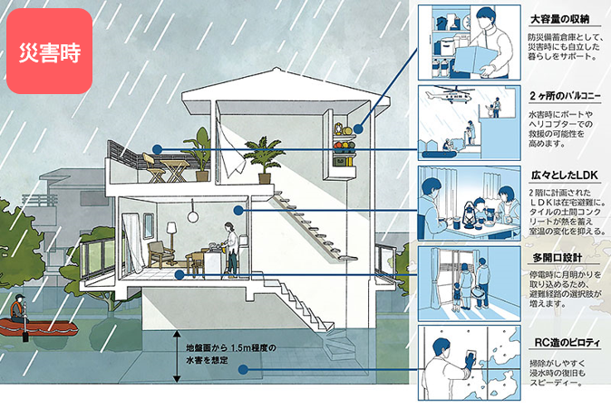 ・水害時、2階バルコニーからはボートで、3階ルーフバルコニーからはヘリコプターでの避難が可能