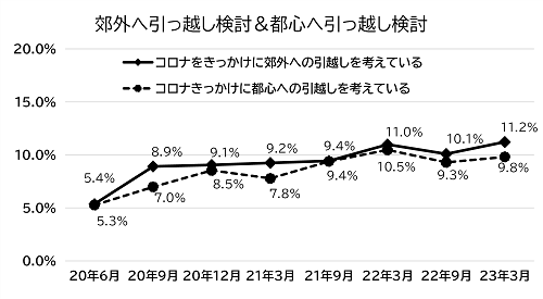 - コロナをきっかけとした引っ越しの検討について、1回目調査と比べると上昇しているものの、郊外vs.都心、地方vs.都会いずれも拮抗