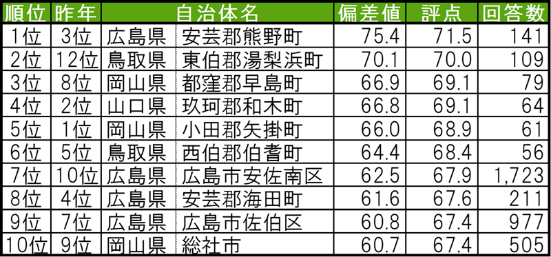 1位は広島県安芸郡熊野町で、昨年3位から順位を上げました。2位は鳥取県東伯郡湯梨浜町(昨年12位)、3位は岡山県都窪郡早島町(昨年8位)で、いずれも昨年から順位を上げてトップ3入りしています。トップ10のうち7つが広島県・鳥取県・岡山県・山口県の各郡部に属する「町」です。