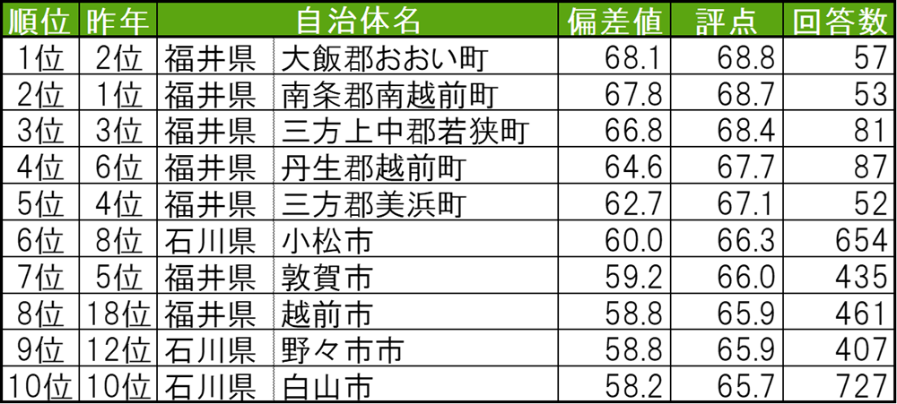 1位は福井県大飯郡おおい町、2位は福井県南条郡南越前町です。3位は、2年連続で福井県三方上中郡若狭町です。トップ10内では、8位の福井県越前市が、昨年18位から順位を上げてトップ10入りしています。トップ5は、全て福井県の郡部に属する「町」という結果になっています。