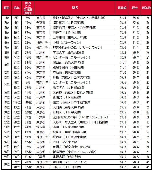 1位は、築地・新富町A(築地・東銀座・築地市場・新富町を統合)で、唯一偏差値80台の極めて高い評価を得ています。2位は、千葉県千葉市美浜区に位置する海浜幕張(JR京葉線)で、昨年4位から順位を上げました。3位は、4年連続で東京都江東区に位置する清澄白河です。
