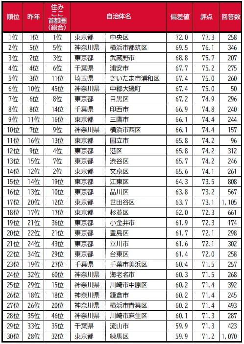 1位は5年連続で東京都中央区で、「住みここち<首都圏版>」でも1位の高い評価を得ています。2位は神奈川県横浜市都筑区で、昨年5位から順位を上げました。3位は東京都武蔵野市です。トップ10内の自治体のうち6自治体が、「住みここち<首都圏版>」でもトップ10にランクインしています。一方、神奈川県中郡大磯町は、「住みここち<首都圏版>」では45位ですが、子育て世帯からの評価は高く、昨年10位からさらに順位を上げて、今年は6位にランクインしています。