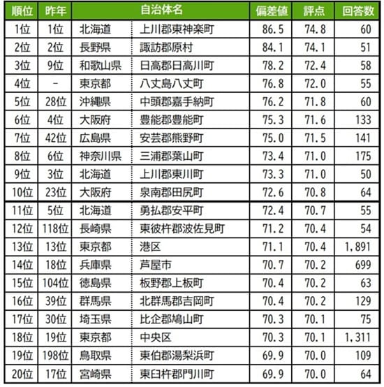トップ2は2年連続で、1位は北海道上川郡東神楽町、2位は長野県諏訪郡原村で、いずれも偏差値80台の極めて高い評価を得ています。3位は和歌山県日高郡日高川町で、昨年9位から順位を上げました。その他トップ10内で初登場の自治体は4位の東京都八丈島八丈町で、昨年は累計回答者数が50名未満でランキングの集計対象外でした。