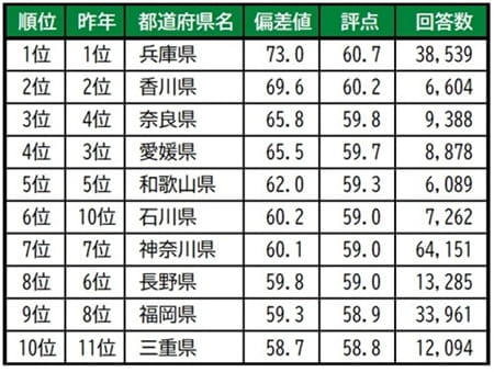 兵庫県が5年連続での1位で、唯一偏差値70台の高い評価を得ています。2位は、4年連続で香川県です。3位は奈良県で、昨年4位から一つ順位を上げました。