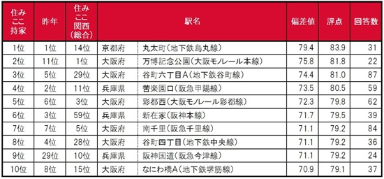 1位は、3年連続で京都府京都市中京区に位置する丸太町です。2位は大阪府吹田市に位置する万博記念公園で、昨年11位から大きく順位を上げました。3位は谷町六丁目A(近接駅の谷町六丁目・松屋町を統合)です。