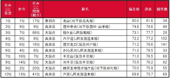 1位は京都府京都市北区に位置する北山で、唯一偏差値80台の極めて高い評価を得て、2年連続で1位に輝きました。2位は兵庫県神戸市西区に位置する西神中央(昨年9位)、3位は大阪府大阪市阿倍野区に位置する鶴ケ丘(昨年7位)で、いずれも昨年から順位を上げて上げてトップ3入りしています。