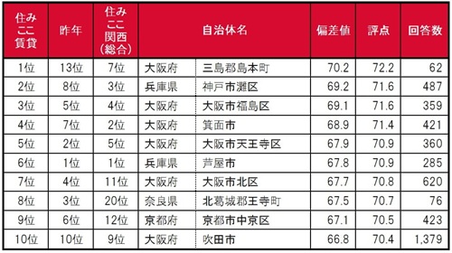 大阪府三島郡島本町が、唯一偏差値70台の高い評価を得て、昨年13位から大きく順位を上げて1位に輝きました。2位は兵庫県神戸市灘区(昨年8位)、3位は大阪府大阪市福島区(昨年5位)で、いずれも昨年から順位を上げてトップ3入りしています。