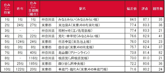 1位は5年連続で神奈川県横浜市西区に位置するみなとみらいで、唯一偏差値80台の極めて高い評価を得ており、「住みここち<首都圏版>」でも1位です。2位は東池袋A(近接駅の東池袋四丁目・東池袋・都電雑司ヶ谷を統合)で、昨年24位から順位を上げました。3位は神奈川県鎌倉市に位置する稲村ヶ崎で、昨年は累計回答者数が20名未満でランキングの集計対象外でした。