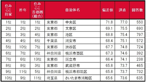 1位と2位は5年連続で、1位は東京都中央区、2位は東京都文京区で、トップ2は、「住みここち<首都圏版>」でも同じくトップ2となる高い評価を得ています。3位は、3年連続で東京都港区です。