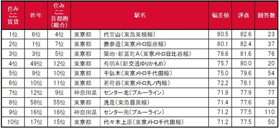 1位は東京都渋谷区に位置する代官山で、昨年6位から順位を上げました。2位は、表参道です。3位は3年連続で、築地・新富町A(近接駅の築地・東銀座・築地市場・新富町を統合)です。その他トップ10内では、4位の有明A(近接駅の有明・国際展示場・東京ビッグサイト・有明テニスの森を統合)(昨年49位)、8位の洗足(昨年58位)が、昨年より大きく順位を上げてトップ10入りしています。