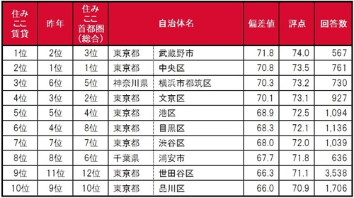 1位は、昨年2位から順位を上げた東京都武蔵野市です。2位は東京都中央区、3位は昨年6位から順位を上げた神奈川県横浜市都筑区です。トップ10のうち、8つが東京都の自治体という結果になっています。