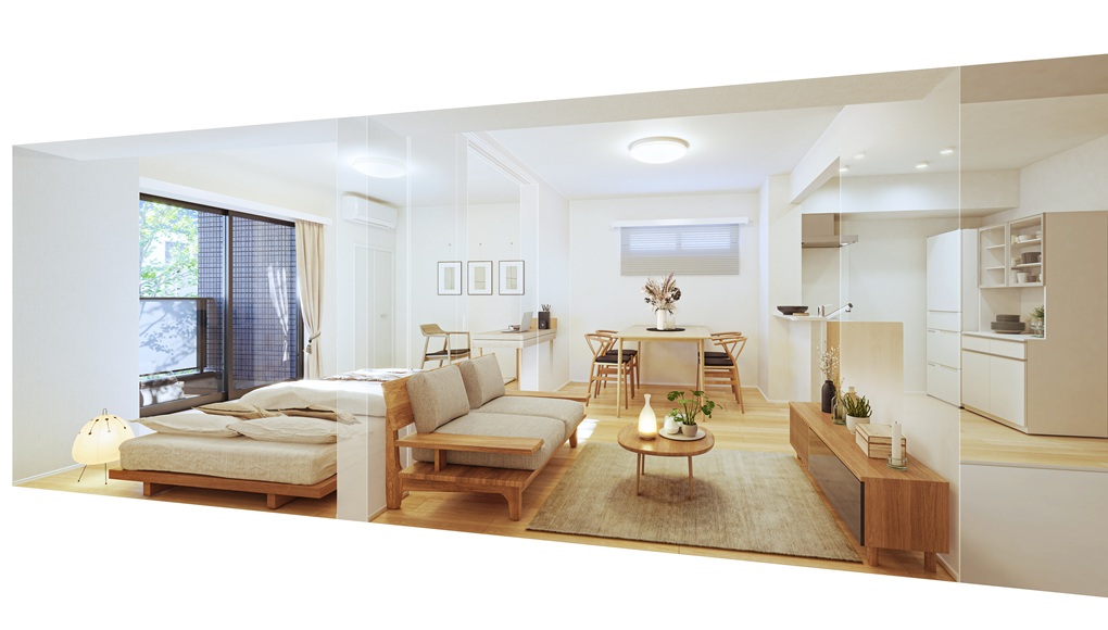 三本引き違い戸により、空間を区切ったりつなげたりできるフレキシブルな間取りです。また都市部の暮らしに安心なセキュリティアイテムを装備しています。
