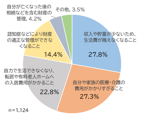 つまり、生活費や医療・介護等の費用がかさむことにより「現在の貯蓄や収入で支出をまかなえなくなること」への不安が8割近くを占めているのです。